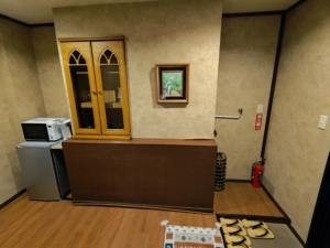 お部屋の玄関です。写真だと伝わりにくいですが、広いスペースが確保され、こちらに電子レンジや冷蔵庫、ケトルやコップ等の収納棚がありました。