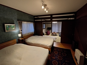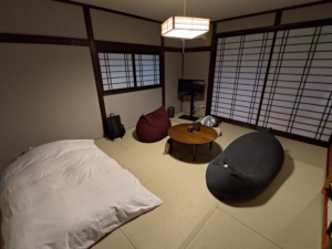 今回のお部屋は和室10畳+洋室8畳からなるツインルームです。一番低いグレードのお部屋ですが、二間あるのでとても大きなお部屋でした。お部屋の良かった点は2つ。1つはお茶っ葉が蒸されており、お茶の香りが部屋中に広がっていたことです。香りのお陰で終始落ち着くことができ、高級旅館に来たという感覚に陥ることが出来ました😊 もう1つは和室にYogiboが置いてあったことです。人を駄目にするソファとして名高いYogiboですが、本当に気持ち良かったです😎 これには同行者も喜んでいました。