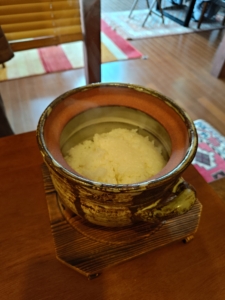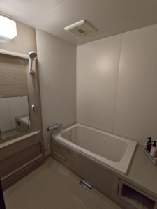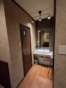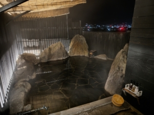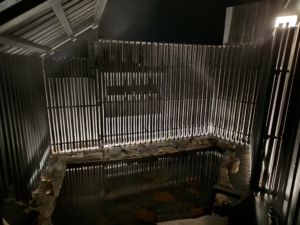 貸切露天風呂は大小2つから構成されております。大タイプは景色も楽しめますが、小タイプはとにかく温泉に集中する作りでした。どちらもシャワーが1つしかないので、基本的には大浴場かお部屋のお風呂で身体を洗ってから、2回目の温泉を楽しむという形で入る感じですね。