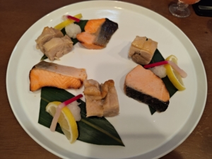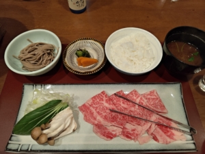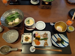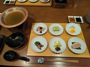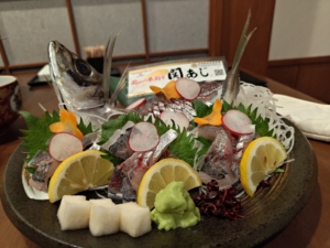 こちらは夕飯です。関アジと和牛のしゃぶしゃぶを両方楽しめるプランです。関アジは大分県の佐賀関で取られるブランド魚ですね。どちらかと言えば関サバの方が知名度は高いと思いますが、とても美味しく頂きました。