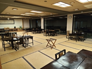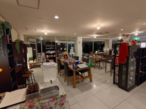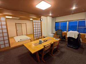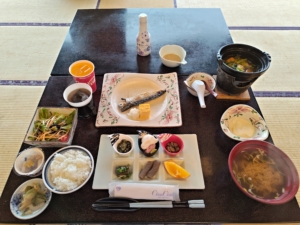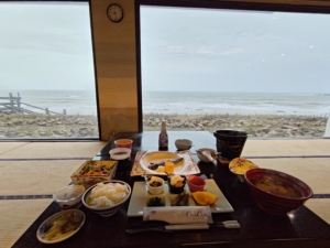 1枚だけ夜に撮った写真ですが…こちらは朝食会場です。夕食会場の隣のお部屋でした。朝食も海を眺めながら頂くことができ、最高でした😎 朝食も自分だけ一番遅い時間で、本当に皆様には申し訳なかったです…それなのに気を使って頂いて、ご飯とお味噌汁おかわりしなくていいの!?と声を掛けてくださり、温かさを感じました😭