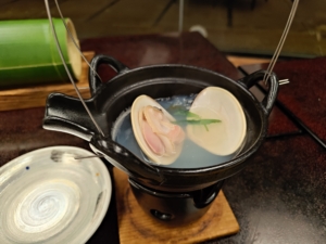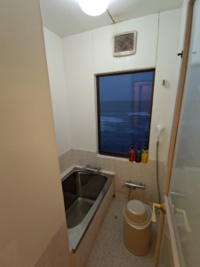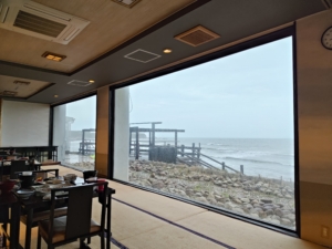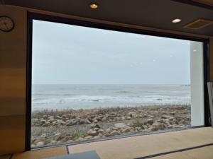 ガラスが反射して見えにくいですが、自分だけ海が目の前に見える特等席でした😅 仲居さんに尋ねてみたところ、1人利用の方の特権だと仰っていました✨